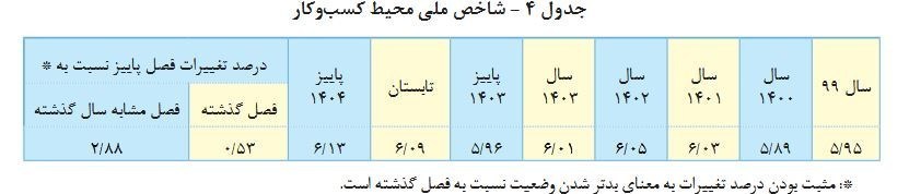 به‌طور کلی، محیط کسب‌وکار ایران در پاییز 1404 نسبت به فصل گذشته با افزایش جزئی نامساعدی روبه‌رو شده است. مهم‌ترین چالش‌های پیش‌روی فعالان اقتصادی، بی‌ثباتی قیمت‌ها، مشکلات تأمین مالی و نوسانات قوانین و مقررات گزارش شده‌اند. با این حال، برخی استان‌ها و رشته‌های فعالیت اقتصادی از شرایط نسبتاً بهتری برخوردار هستند؛‌اما به طور کلی وضعیت فضای کسب‌وکار همچنان در کشور مناسب نیست.