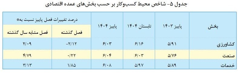 محیط کسب‌وکار در بخش خدمات با نمره 6.08، نامناسب‌تر از بخش‌های صنعت (6.04) و کشاورزی (6.03) ارزیابی شده است.