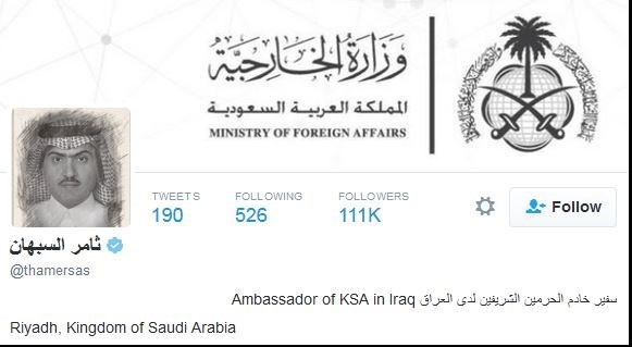 تذكر موسوعة ويكيبيديا أن السفير هو: الموظف الدبلوماسي الأعلى الذي يترأس سفارة لتمثيل بلاده في الخارج. عادةً يُوفد السفير للحكومات أو الأقاليم المستقلة الأجنبية أو المنظمات الدولية ليمثل حكومة بلاده (أو بلادها، إن كانت سفيرة)، أما في حالة ثامر السبهان، فهو يعلن صراحة أنه يمثل الملك السعودي بدلا من أن يمثل السعودية. وأدناه نرفق صورة الصفحة الرسمية للسبهان على موقع التواصل الاجتماعي "تويتر".