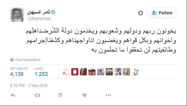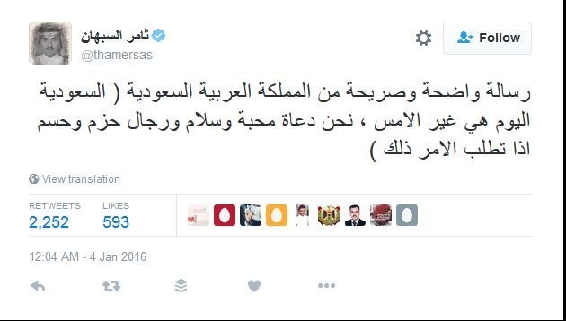 وأرسل السبهان عبر تويتر رسالة إلى رئيس الحكومة العراقية حيدر العبادي قال فيها: "أخاك من نصحك وصارحك"، تهجم فيها على الحشد الشعبي وقياداته والمستشارين الأمنيين الذين يمدون يد العون للعراق في الحرب على الارهاب، فيما عُد تجاوزا سافرا للاعراف الدبلوماسية.