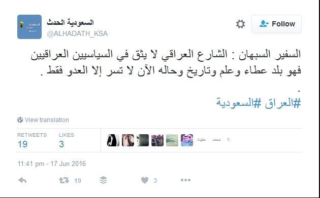 في يناير عام 2016، دعت رئيسة حركة "إرادة" النائبة العراقية حنان الفتلاوي الجمعة، السعودية إلى إدخال سفيرها في العراق ثامر السبهان "دورة مكثفة حول أصول العمل الدبلوماسي".