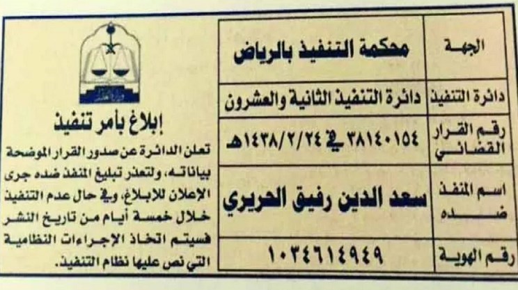 ونشرت محكمة التنفيذ بالرياض إعلانا في صحيفة "الجزيرة" السعودية الصادرة يوم الخميس 15 ديسمبر/كانون الأول مفاده: "تعلن دائرة التنفيذ الثانية والعشرون عن صدور القرار القضائي الصادر في 24/ 2/ 1438 (هجرية) ضد المنفذ ضده سعد الدين رفيق الحريري، وذلك بعد تعذر تبليغ المنفذ ضده".