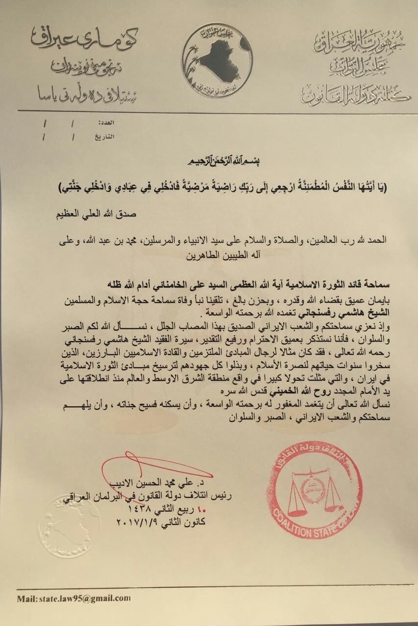 ائتلاف دولة القانون في البرلمان العراقي يعزي بوفاة آية هاشمي رفسنجاني