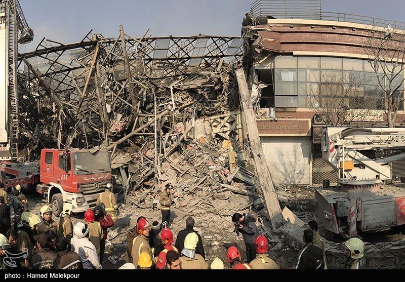 وأفادت وكالة تسنيم الدولية للأنباء ان عشرات سيارات الإطفاء وعشرات رجال الإطفاء كانوا موجودين في المكان لإطفاء هذا الحريق منذ الصباح الباكر لكن البرج قد إنهار وبقي العشرات من رجال الإطفاء تحت الأنقاض.