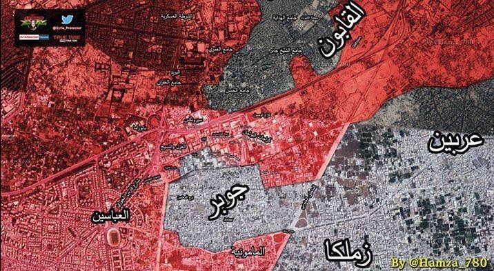 كما يواصل سلاح الجو ضرباته العنيفة على مواقع وتحركات الإرهابيين في حيي "جوبر والقابون"، وكان الجيش السوري تصدى لهجوم جديد يوم أمس للنصرة وفيلق الرحمن على كافة المحاور في جوبر بعد تفجير مفخخة بالقرب من نقاط الجيش.