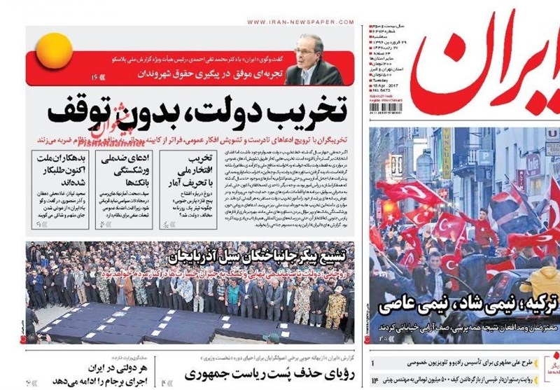 تداولت الصحف الإيرانية الصادرة بطهران صباح اليوم الثلاثاء مجموعة من الموضوعات والتقارير الخبرية، من ابرزها نتائج الاستفتاء على تغييرالدستور في تركيا والمؤتمر الصحفي للمتحدث بإسم الخارجية الايرانية وجولة ظريف على تركمنستان وجورجيا وقرغيزيا.