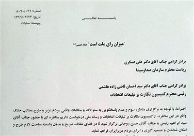 طالب ممثل المرشح ابراهيم رئيسي في رسالة الى رئيس الاعلام الوطني اجراء مناظرة بين المرشحين للرئاسة الايرانية ابراهيم رئيسي وحسن روحاني.