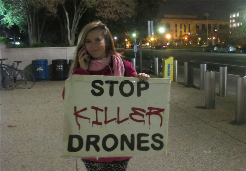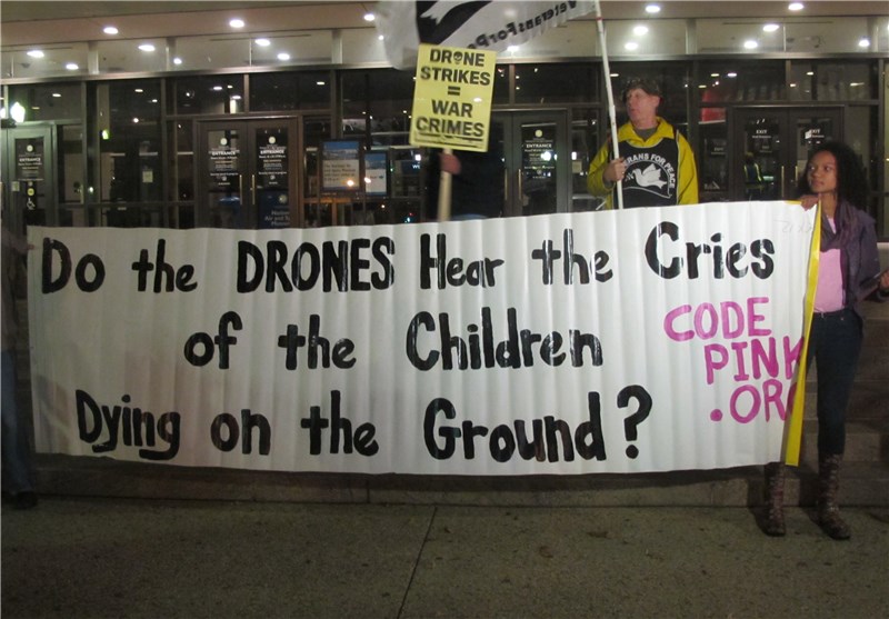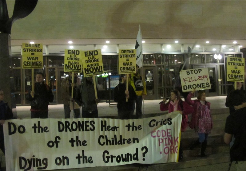 They also shouted slogans against the US administration’s warmongering policies, and condemned the use of drones against people in Pakistan, Yemen, and other parts of the world.
