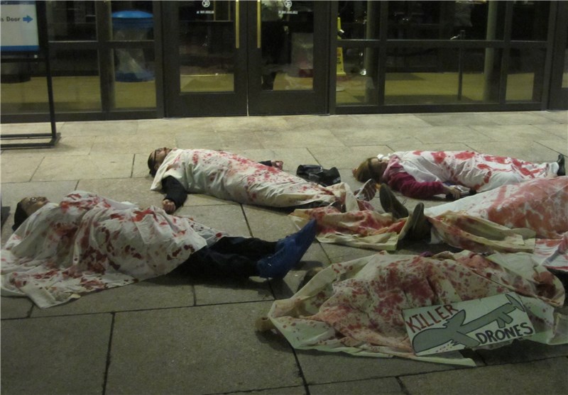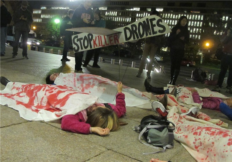 The protesters carried a mock-up of a drone and several placards reading “Drone Strikes = War Crimes”, “End US Drone War Now!”, and “Stop Killer Drones”, among others.