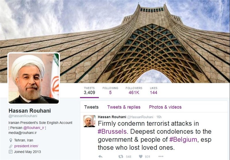 In a message in his Twitter account, President Rouhani offered his condolences to Belgium on the bloody attacks.