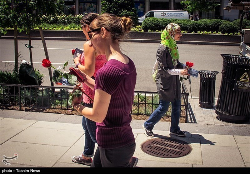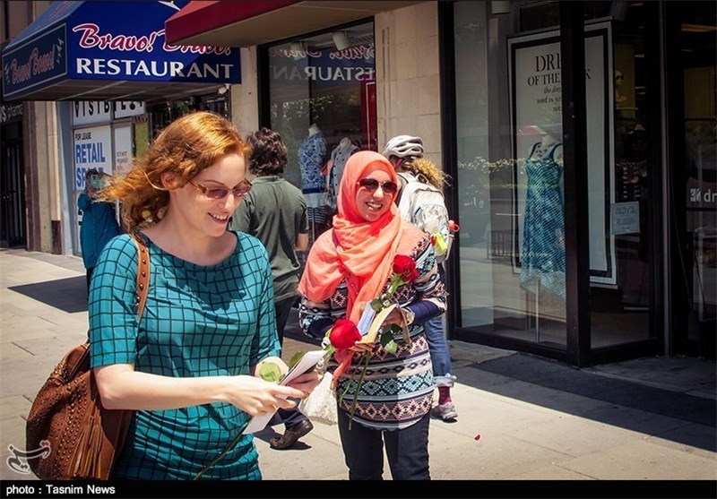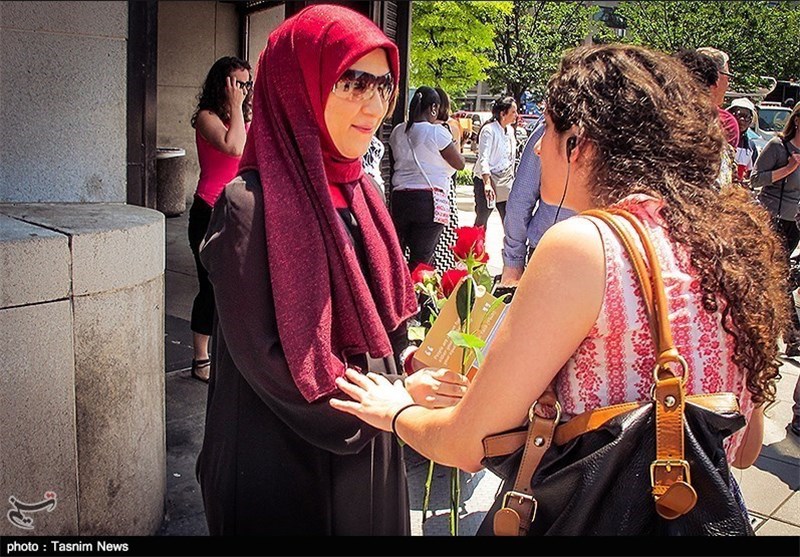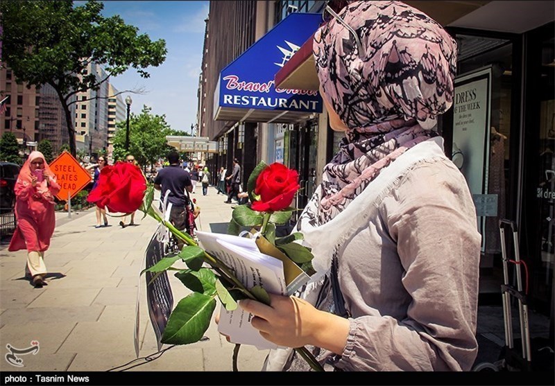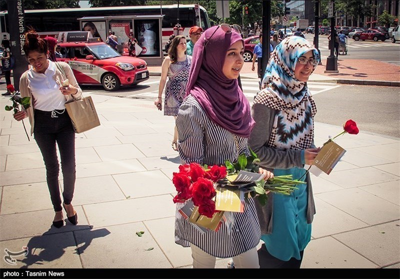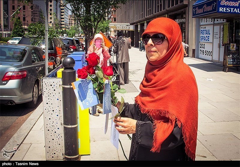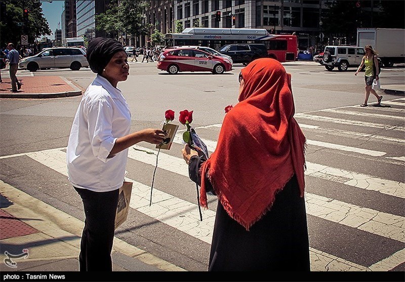 Passersby in front of one of the US capital’s busiest subway stations had the chance to receive a rose from a Muslim lady with a card attached to it, reading a hadith from revered Muslim figures, including the first Shiite imam, Imam Ali (AS), showing Islam’s insistence on equality of people.