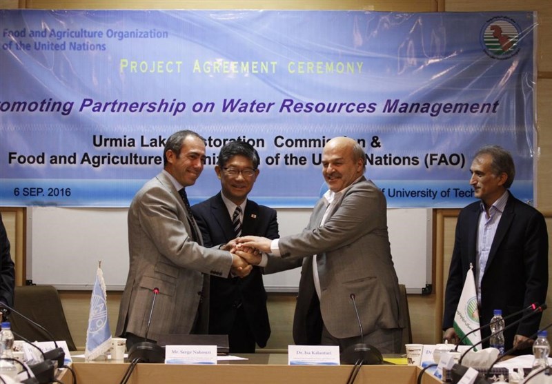 At the ceremony held at Sharif University of Technology on Tuesday, Mr. Serge Nakouzi, the FAO Representative to the Islamic Republic of Iran and to the Economic Cooperation Organization (ECO), and Dr. Issa Kalantari, Adviser to the Iranian President on Water, Agriculture and Environment, who is also the Secretary of Urmia Lake Restoration Commission (ULRC) signed the agreement in the presence of Japan's ambassador to Iran, Hiroyasu Kobayashi.