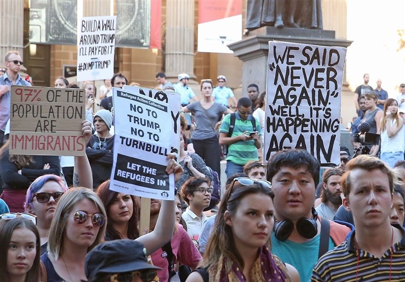 In Sydney on Saturday, protesters marched to the US consulate, chanting “Dump Trump”.
