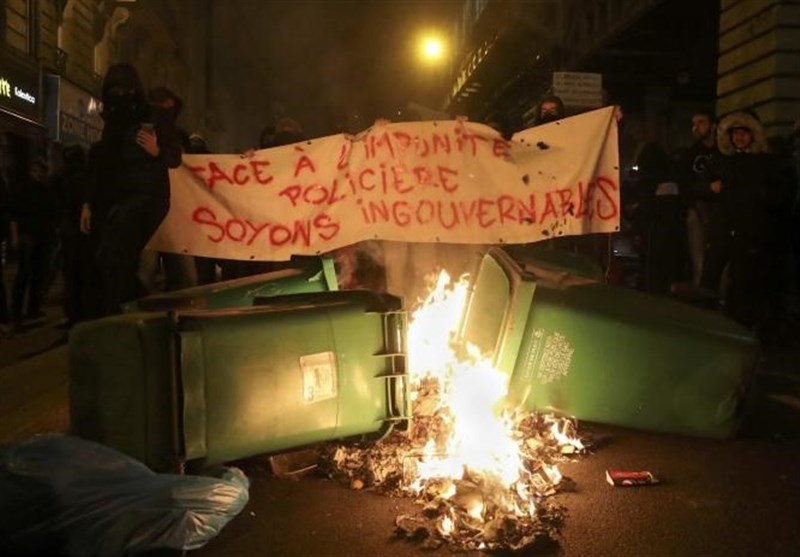 Protesters in the 18th District in the north of Paris lit piles of rubbish and rubbish bins on fire in the streets as riot police threw tear gas canisters, which were in turn thrown back at them.