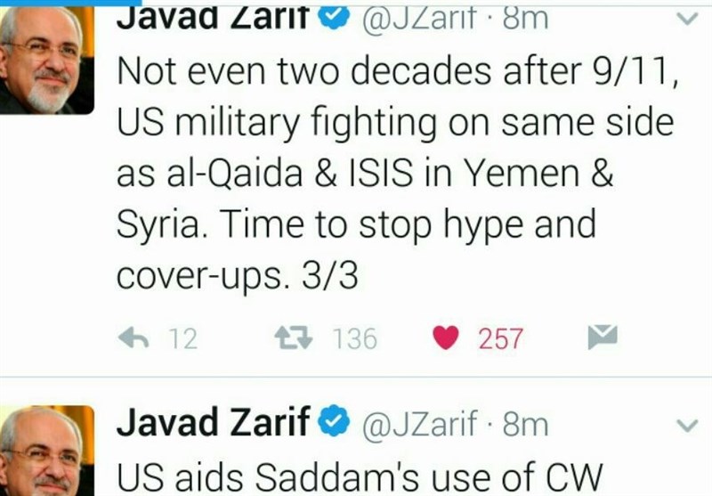 “Not even two decades after 9/11, US military fighting on the same side as al-Qaida & ISIS in Yemen & Syria,” Zarif said on his twitter account on Friday.