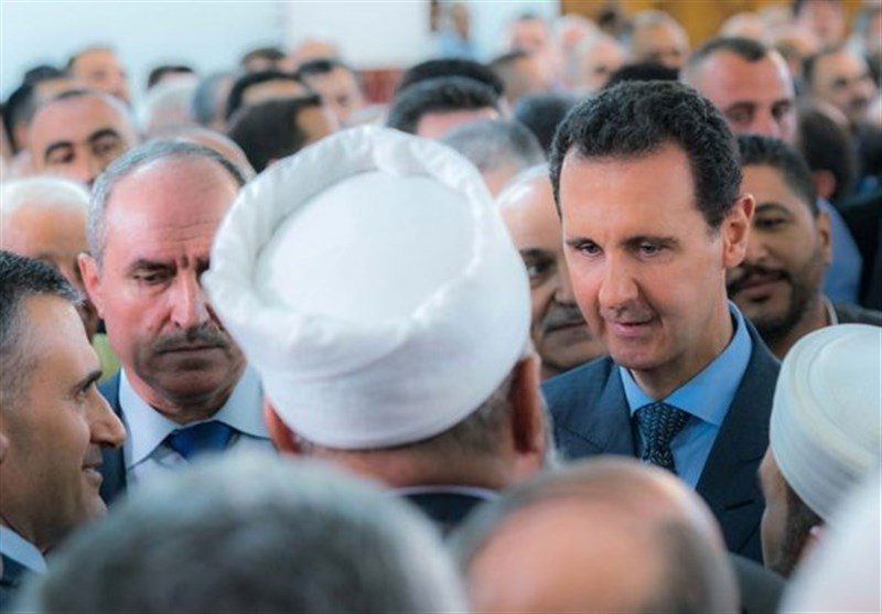 "President Assad performs the Eid al-Fitr prayers at the Sayyida Khadija mosque in the city of Tartus," a caption read, referring to the feast marking the close of the Islamic holy month, AFP reported.