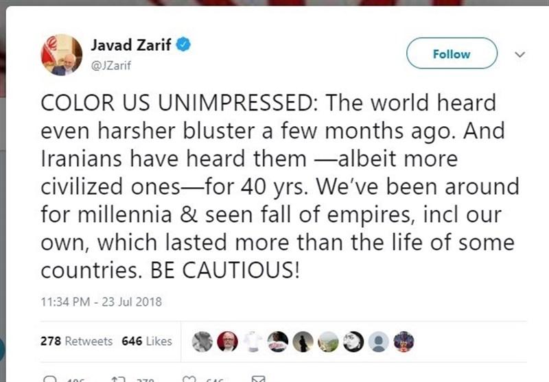 “COLOR US UNIMPRESSED: The world heard even harsher bluster a few months ago. And Iranians have heard them —albeit more civilized ones—for 40 yrs. We’ve been around for millennia & seen fall of empires, incl our own, which lasted more than the life of some countries. BE CAUTIOUS!,” Zarif said late on Monday in a message posted on his Twitter account.
