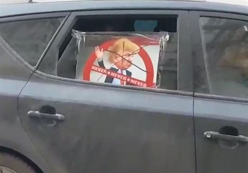 A video taken from the demonstration shows pictures of General Soleimani mounted on the side windows of the protester’s cars, as they also carry caricatures of warmonger Trump during their protest, while they honked their car horns in front of the US Embassy.