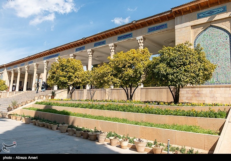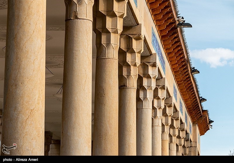 The four original columns in the centre were retained, and sixteen other stone columns of one piece and of similar shape were prepared, and the present colonnade of twenty columns of a length of 56 meters was erected, with decorative designs, plaster mouldings and faience, in accordance with ancient and original Shiraz styles. The original tombstone was raised on an eight-sided platform on which eight stone columns stand.