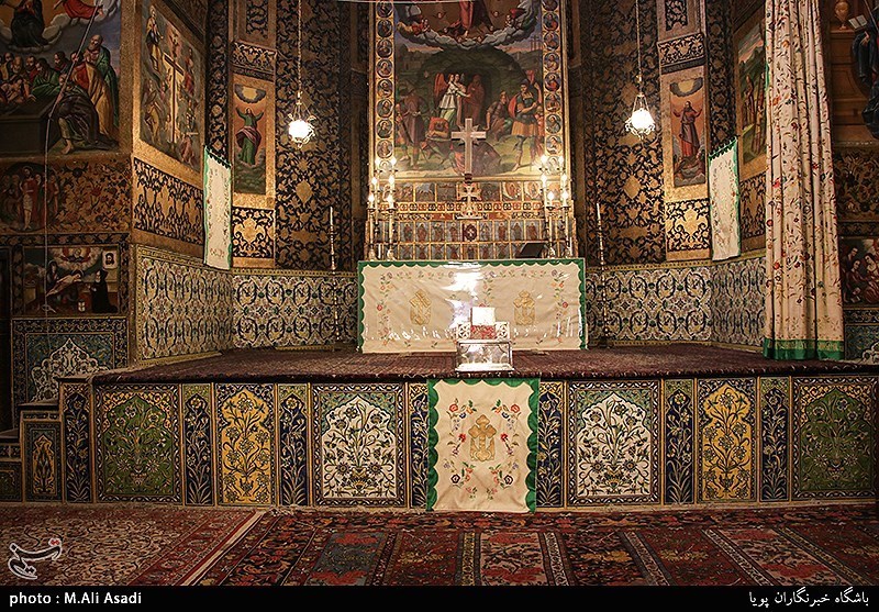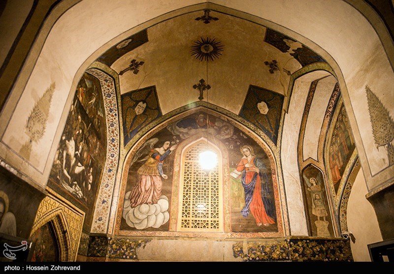 Its sumptuous interior is richly ornamented with restored wall paintings full of life and color, including gruesome martyrdoms and pantomime demons. The ceiling above the entrance is painted with delicate floral motifs in the style of Persian miniature.