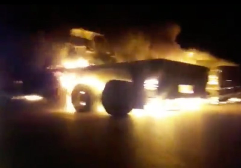 TEHRAN (Tasnim) – Videos have emerged online showing flames consuming three vehicles reportedly from an attacked US military convoy.