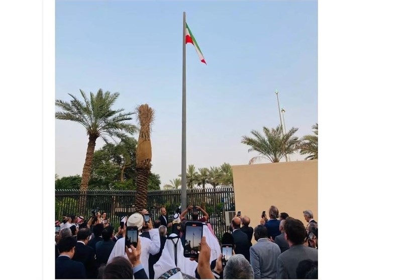 The ceremony was held in Riyadh on Tuesday to formally reopen the Iranian embassy in the presence of Iran’s Deputy Foreign Minister for Consular, Parliamentary, and Iranian Expatriates Affairs Alireza Bikdeli, Hassan Zarnegar, the caretaker of the mission, Saudi Deputy Minister of Foreign Affairs for Consular Affairs Ali Al-Yousef, and a number of other Foreign Ministry officials as well as ambassadors and diplomats and representatives of regional and international organizations accredited to Riyadh.