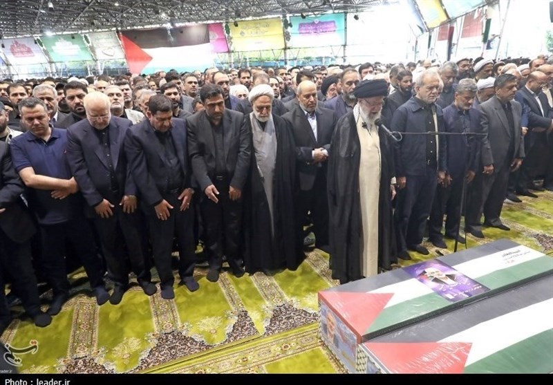 TEHRAN (Tasnim) – Leader of the Islamic Revolution Ayatollah Seyed Ali Khamenei led funeral prayers for Hamas Political Bureau Chief Ismail Haniyeh and his security guard, Wasim Abu Shaaban, in Tehran on Thursday.