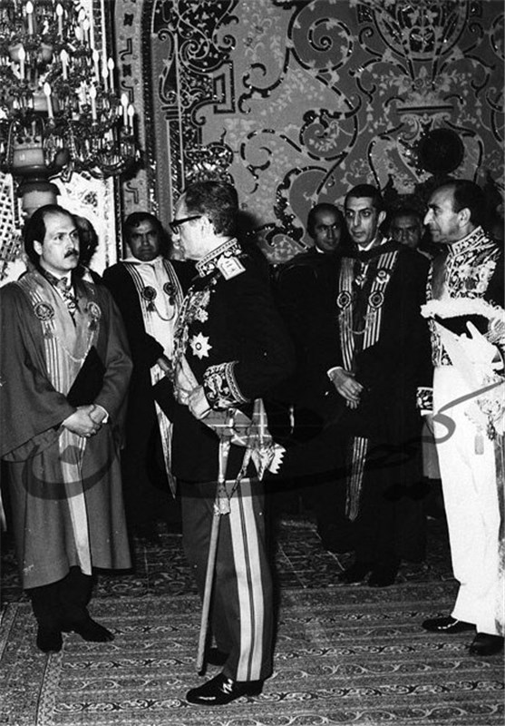 «سیدحسین نصر» (از شاگردان فرای و کیسینجر/ نفر اول از چپ) صبح 3 بهمن 1351 با لباس تشریفاتی سلطنتی در مراسم «سلام عید غدیر» در حضور «محمدرضا پهلوی». «اسدالله علم» (وزیر دربار/ نفر اول از راست) نیز در عکس دیده می‌شود.