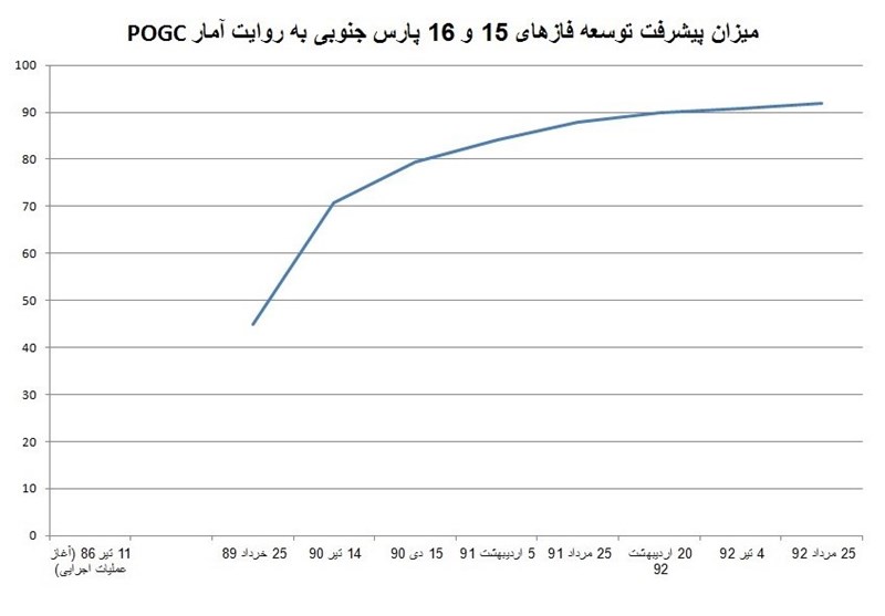 روند پیشرفت فیزیکی توسعه فازهای 15 و 16 پارس جنوبی (به درصد) در قالب نمودار بدین صورت است: