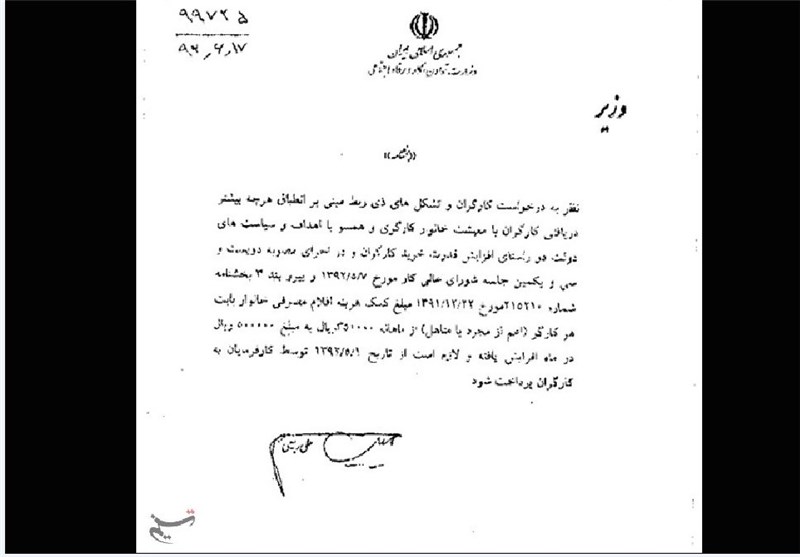 خبر گزاری تسنیم تصویر ابلاغیه وزیر کار برای افزایش 15 هزار تومانی بن خواروبار کارگران از اول مرداد را به شرح زیر منتشر کرد.