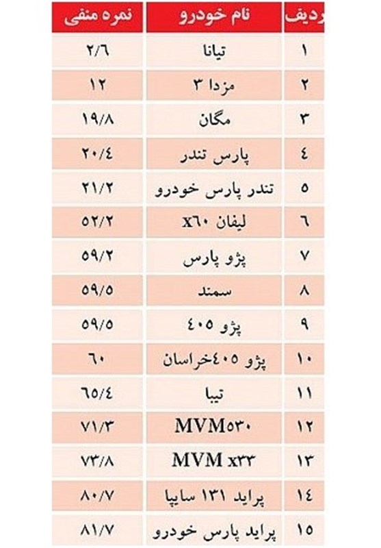 خبرگزاری تسنیم: جدیدترین گزارش کیفی خودروهای سواری تولید داخل در حالی اعلام شد که در آن تنها نام 15 محصول به چشم می‌آید و ابتدا و انتهای جدول رده بندی نیز همچنان در اختیار نیسان تیانا و پراید است.