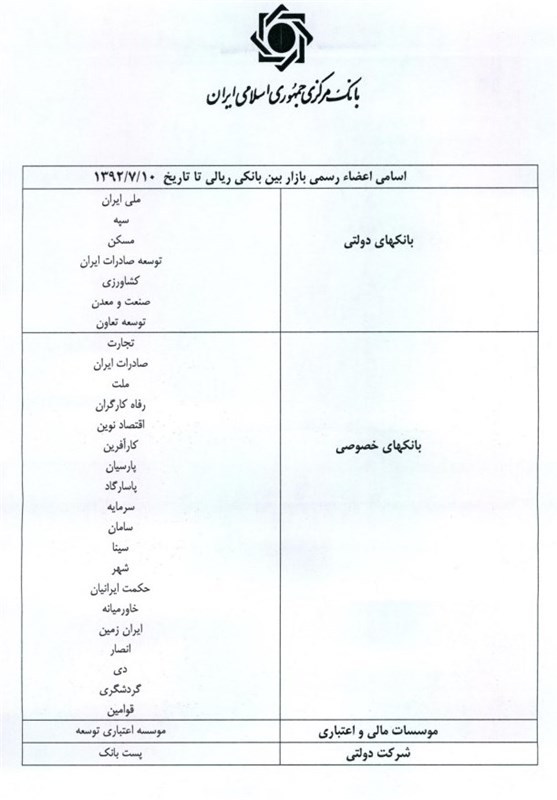 مدیریت کل اعتبارات بانک مرکزی ضمن اینکه در این بخشنامه خواستار عدم ارائه خدمات بانکی به موسسات و بانک های غیر مجاز شده است، تأکید کرده که " با عنایت به پذیرش عضویت بانک جدید در بازار بین بانکی ریالی، به پیوست آخرین لیست بانکها و موسسات اعتباری که تاکنون به صورت رسمی و با مجوز بانک مرکزی مجاز به فعالیت در این بازار می باشند، جهت استحضار ارسال می گردد".