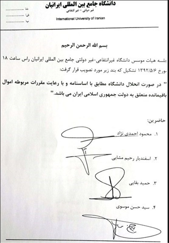 به گزارش خبرنگار گروه "رسانههای دیگر" خبرگزاری تسنیم، سایت دانشگاه احمدی نژاد به نشانی اینترنتی iiu.ac.ir با صدور اطلاعیه ای اعلام کرد: "با تصویب هیات موسس دانشگاه جامع بینالمللی ایرانیان اموال این دانشگاه در صورت انحلال به دولت جمهوری اسلامی ایران تعلق میگیرد."