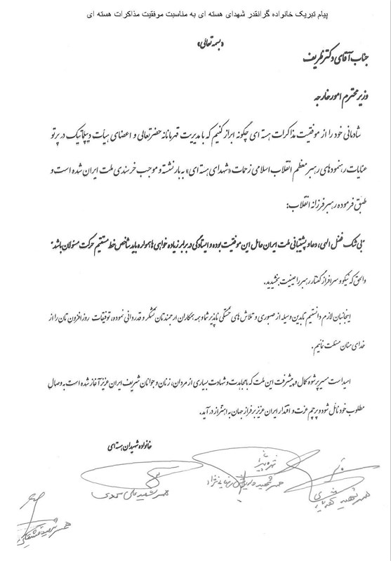 شادمانی خود را از موفقیت مذاکرات هسهای چگونه ابراز کنم که با مدیریت قهرمانانه حضرتعالی و اعضای هیات دیپلماتیک در پرتو عنایات رهنمودهای رهبر معظم انقلاب اسلامی زحمات « شهدای هستهای» به بار نشسته و موجب خرسندی ملت ایران شده است و طبق فرموده رهبر فرزانه انقلاب: