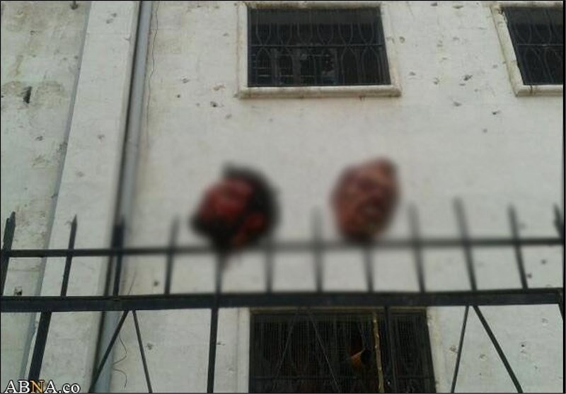 این دو شهروند سوری به دلیل حمایت از حکومت بشار اسد و عمل نکردن به فتواهای اجباری این گروه تروریستی ذبح شده و سر آنها بر سر در یکی از مراکز فرهنگی که در تصرف این گروه است آویزان شده است.