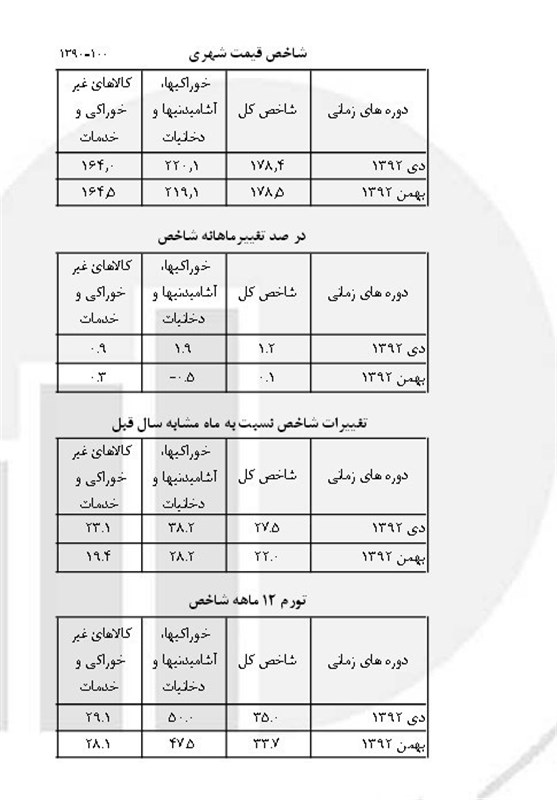 درصد تغییرات شاخص کل (نرخ تورم شهری) در دوازده ماه منتهی به بهمن ماه سال 92 نسبت به دوره مشابه سال قبل 33.7 درصد است که نسبت به تورم دوازده ماه منتهی به دی ماه سال جاری (35 درصد) کاهش یافته است.