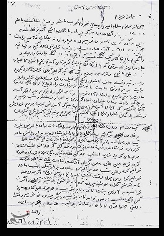 پس از عرض سلام، امیدوارم حال خودم خوب باشد و همیشه سلامت باشم. بعد از آنهمه دردسر که در راه پادگان داشتیم، آمدیم خط مقدم. همین الآن که این نامه را مینویسم، دو تا خمپاره زدند بغلمان. خلاصه برایت بگویم. آتش خمپاره است. دیشب قرار بود حمله کنیم و یک تپه را بگیریم. ما اینجا کنار یک تنگه هستیم که عراقیها از آن تنگه جاده را میبینند و جاده را میزنند، موقعی که با (یکی دیگه زدند) تویوتا میآمدیم، پنج یا شش تا خمپاره زدند بغل ماشین و قرار بود برویم و یک تپه که جلویمان قرار دارد، بگیریم. و بعد از تپه، دشت صاف تا مندلی (یکی دیگر خمپاره زدند) در مقابلمان قرار دارد. برایت بنویسم که وقتی ساعت 4 بعد از ظهر از سفارت راه افتادیم (یکی دیگه زدند) ساعت 6 صبح، رسیدیم به اسلامآباد غرب و تا بعد از ظهر ول بودیم. بعد از ظهر آمدند و پلاک دادند و ما را بهعنوان امدادگر رزمی به سومار فرستادند و شب رسیدیم آنجا. به ما گفتند که آیا شما آموزش دیدید. و ما هم که آموزش ندیده بودیم فردایش فرستادند پادگان ششدار ایلام. یک هفته آنجا بودیم و بعد از آموزش تئوری، یک روز هم در درمانگاه ایلام بودیم. در درمانگاه، باند برای باندپیچی نبود و خلاصه برگشتیم به پادگان و ما را فرستادند به اورژانس مادر تیپ محمد رسول الله (صلوات الله علیه) و از آنجا آمدیم به گردان باهنر، دسته 3 که لب خط قرار دارد فرستادند و شب همان روز قرار بود حمله کنیم که حمله به عقب افتاد و بچه میگویند شاید امشب حمله کنیم. خلاصه نیامده یک حمله به تورمان خورد. توجه توجه. همین الآن معاون گردان آمد گفت ساعت 5/5 بعد از ظهر حرکت خواهیم کرد و حتمی امشب حمله خواهیم کرد و خلاصه برادر جان. امشب ما حمله خواهیم کرد و من چون وقت نیست، نامه را تمام میکنم. لطفاً اگر بعد از حمله نامه ننوشتم، نگران نوشید چون من نامه نوشتن بلد نیستم و اگر توانستید به آدرس پشت نامه، نامه بنویسید و چون خودکار مال کس دیگری است، او هم میخواهد نامه بنویسد، دیگر چیزی نمینویسم و فقط سلامتی همگی شما را از خداوند، خواهم. به همه سلام برسانید.