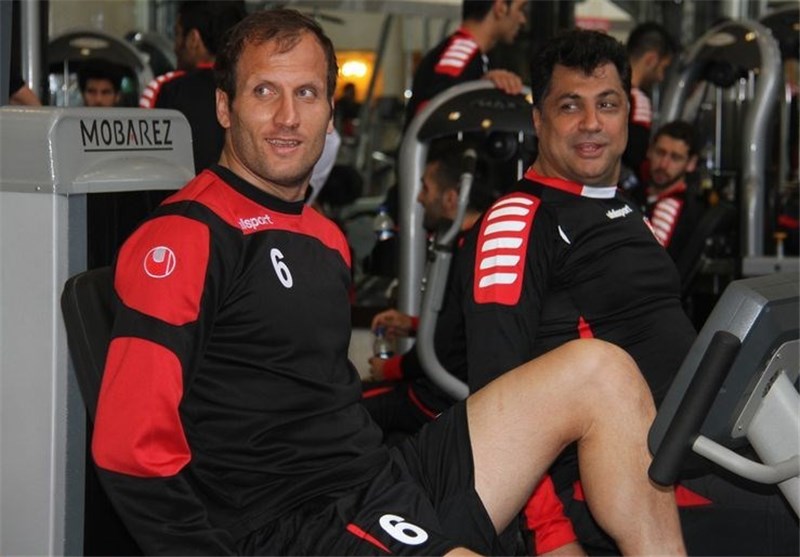 بازیکنان داماش گیلان و پرسپولیس تهران در زمین چمن مصنوعی شهید عضدی رشت در حال گرم کردن هستند.