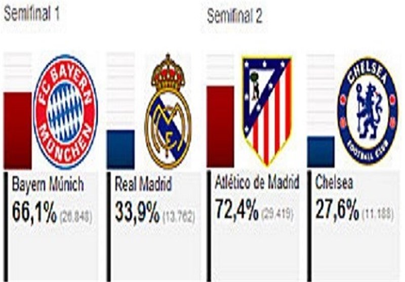 در این نظرسنجی که 40 هزار و 613 نفر در آن شرکت کردند، اکثر هواداران پیش بینی کردهاند در بازی نخست مرحله نیمه نهایی این باواریاییها خواهند بود که با شکست رئال مادرید راهی فینال میشوند.