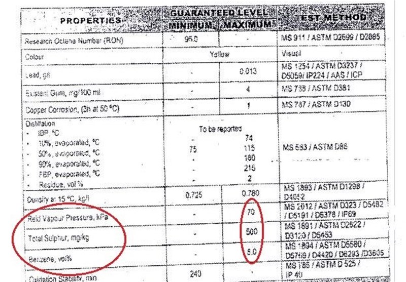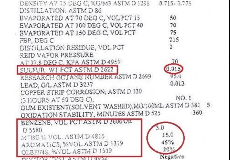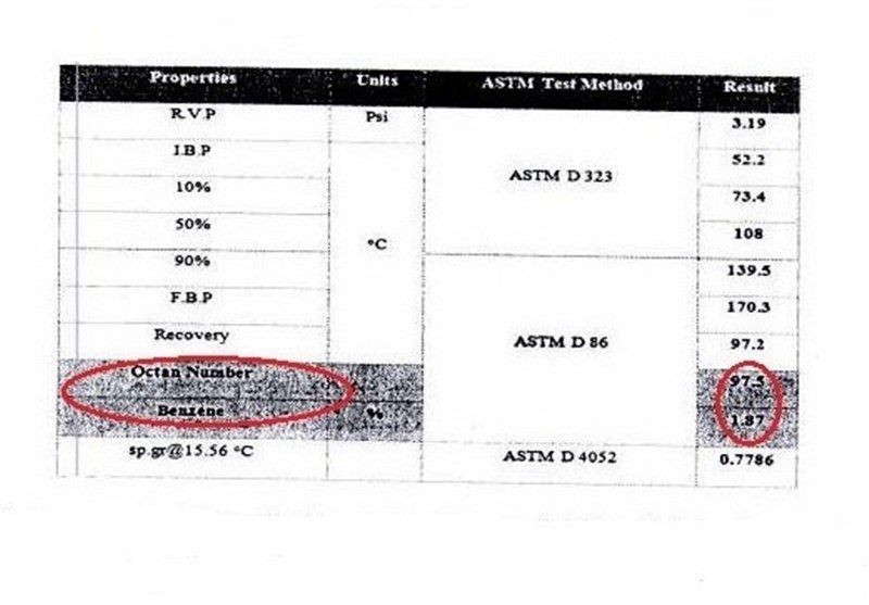 جدول آنالیز دو محموله بنزین وارداتی به کشور که در ذیل این گزارش آمده است نشان میدهد که در اولین محموله "بنزن" هشت درصد و "گوگرد" 500 PPM است. در این جدول اگر چه برخلاف ضوابط واردات بنزین عدد "آروماتیک" مشخص نشده است اما با توجه به درصد انتشار بخار(فرّار بودن بنزین) مشخص میشود که درصد آروماتیک هم بیشتر از استاندارد مشخص شده است.