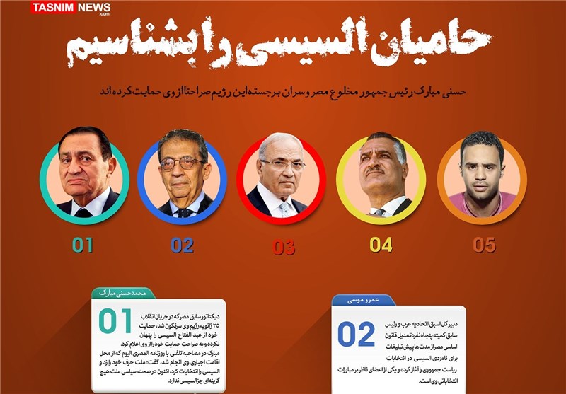 به گزارش گروه بین الملل خبرگزاری تسنیم، «عبد الفتاح السیسی» وزیر دفاع سابق مصر و نامزد انتخابات ریاست جمهوری این کشور از حمایت برخی‌ شخصیت‌های بارز دوره دیکتاتوری مصر برخوردار است که در این میان نام «حسنی مبارک» دیکتاتور مخلوع مصر نیز به چشم می‌خورد.