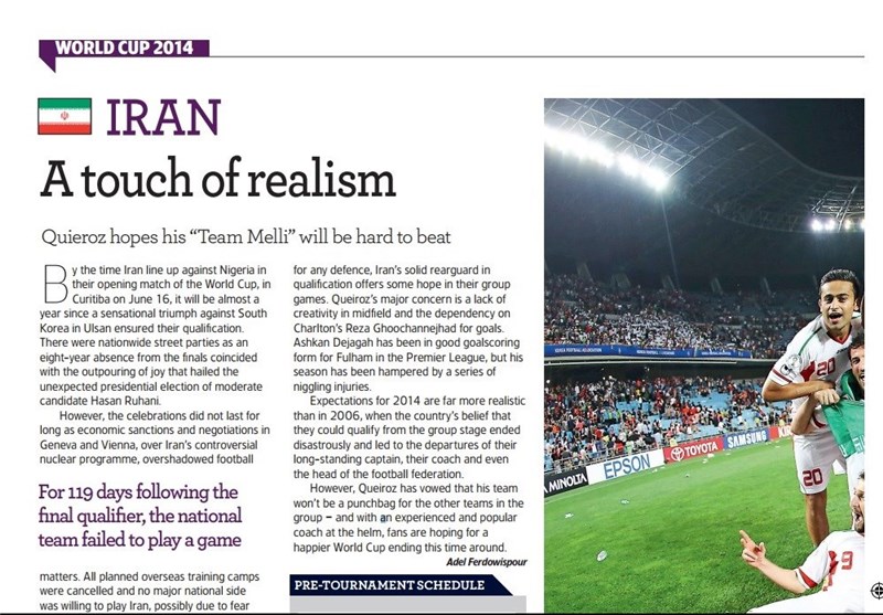 در این گزارش آمده است: 16 ژوئن زمانی که ایران در اولین بازی مرحله گروهیاش در جام جهانی در کوریتیبا برابر نیجریه صفآرایی کند، تقریباً یک سال از زمانی که این تیم توانست کره جنوبی را در آخرین بازیاش در مرحله انتخابی شکست دهد و جواز صعود به مرحله نهایی را بگیرد، گذشته است. بازگشت به جام جهانی پس از هشت سال غیبت، با پیروزی حسن روحانی در انتخابات ریاست جمهوری لذت مضاعفی به مردم ایران داد و جشن و پایکوبی آنها را در خیابانها به همراه داشت.