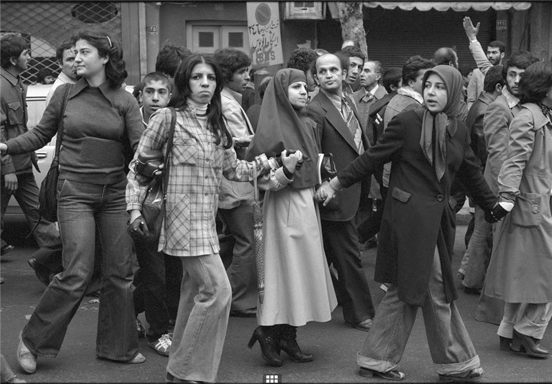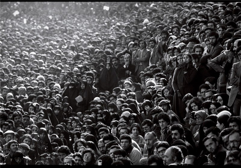 تجمعی از راهپیمایان علیه شاه که دست در دست هم دارند