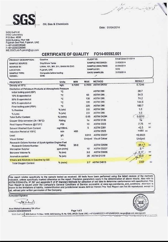 درصد بنزن در این محموله بنزین که در تاریخ 12 فروردین امسال وارد کشور شده است بیش از دو  درصد است؛ این در حالیست که طبق استاندارد یورو 4 ، باید بنزن کمتر از یک درصد باشد. همچنین این آنالیز تایید می‌کند که ترکیبات الکلی و  اِتر نیز در این محموله وجود دارد؛ با توجه به این که مشخص نشده که ترکیب الکلی مورد استفاده چیست، این امکان وجود دارد که  حاوی "متانول" - یک ترکیب خطرناک برای سلامتی- در این ترکیبات وجود داشته باشد.