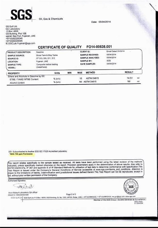 در حالی که سازمان محیط زیست مدعی استفاده از حلالها در ریفرمیت تولید شده در واحدهای پالایشی است که در ادامه آنالیز این محموله بنزین وارداتی شاهد هستیم که از افزودنی های غیرمجاز مانند مشتقات الکلی، ام.ام.تی(معروف به بنزین چینی)، یک نوع حلال عالی و فروسین( Forrocene) با حجم زیاد استفاده شده که کاربردی هم نبوده است.