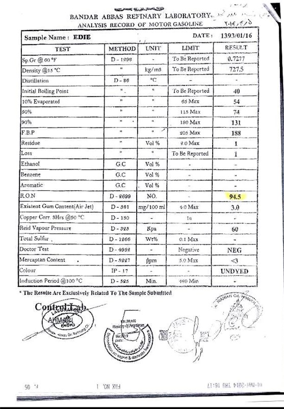 به طور کلی  این دو محموله نه تنها بر اساس استاندارد یورو4 ارزیابی نشده است بلکه حتی برخی از شاخصهای استاندارد یورو2 هم در آنالیزها آزمایش نشده است که این امر نشان می‌دهد ریفرمیت تولیدی در واحدهای پتروشیمی و حتی بنزین پالایشگاهی کیفیت بهتری از بنزین وارداتی دارد.