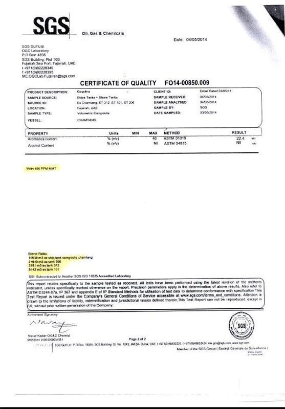 این محموله هم حاوی ام.ام.تی است؛ همان ترکیبی که در رسانه‌های کشور به نام " بنزین چینی"‌معروف شده است و مدیران وزارت نفت تاکید کرده‌اند که این ترکیب به هیچ عنوان در بنزین استفاده نخواهد شد. علی‌رغم این موضوع در آنالیزمحموله بنزین وارداتی مورد نظر شاهد، 100 پی.پی.ام،  ام.ام.تی هستیم.
