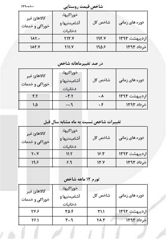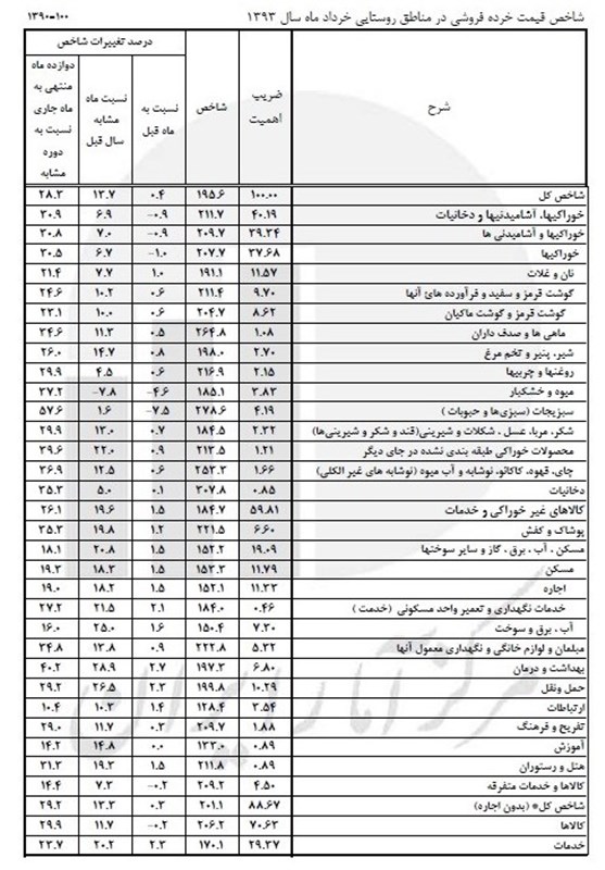 درصد تغییرات شاخص کل (نرخ تورم روستایی) در دوازده ماه منتهی به خرداد ماه سال 93 نسبت به دوره مشابه سال قبل 28.3 درصد است که نسبت به تورم دوازده ماهه منتهی به اردیبهشت ماه امسال ( 31.1 درصد) کاهش یافته است.