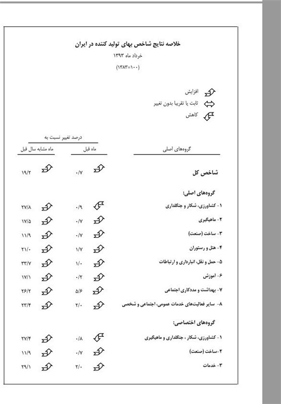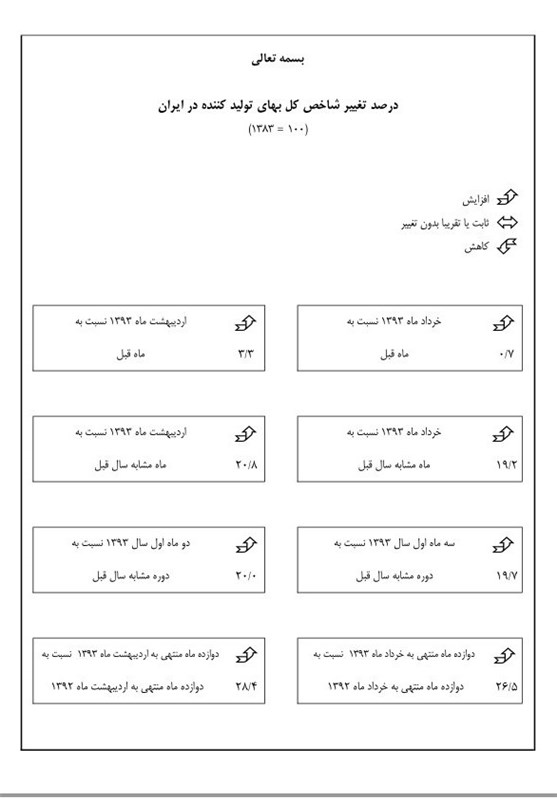 گفتنی است که تورم تولید کننده در دوازده ماه منتهی به اردیبهشت ماه 93 نسبت به دوره مشابه سال قبل 28.4 درصد برآورد شده است؛ البته آنطور که بانک مرکزی اعلام کرده این شاخص دو ماهه اول نسبت به مدت مشابه سال گذشته 20 درصد بوده است.