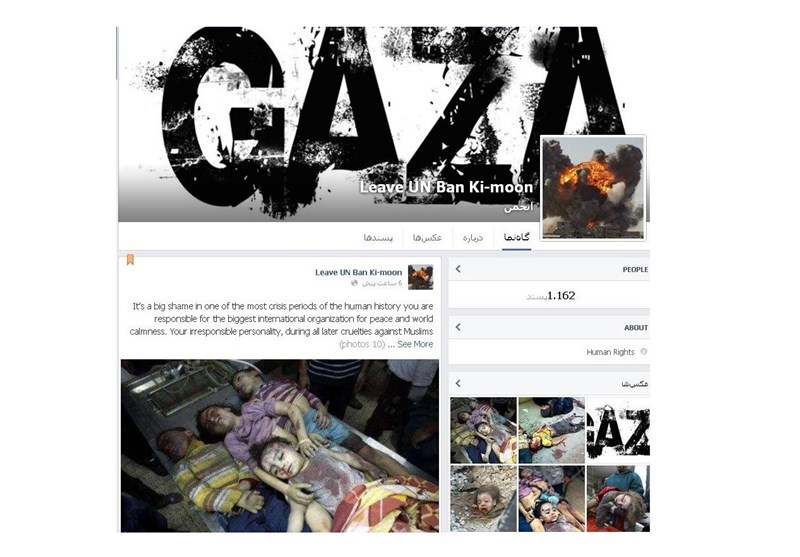 به گزارش خبرگزاری تسنیم، اخیراً در یکی از شبکه‌های مجازی(فیس‌بوک)، کمپینی در حمایت از مردم غزه در برابر جنایات اسرائیل تشکیل شده‌است. این کمپین با توجه دادن دبیرکل سازمان ملل نسبت به‌ فجایع انسانی غزه به‌ویژه جنایاتی که علیه کودکان روی داده، از وی می‌خواهد به دلیل بی‌کفایتی در قبال این فاجعه، هرچه سریع‌تر از این سمت استعفا دهد.